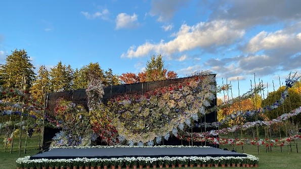 而整個活動中我最喜歡的是”飛翔花朱雀”由各種不同顏色的花所組成,在太陽下山後該區域開始投放影片,與孔雀融為一體,畫面極為壯觀,在最後孔雀會隨著影片的結束一同飛翔離開。