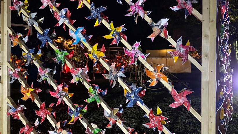 這裡還有一個由風車所組成的展區,各式各樣的風車在風起時一起旋轉,周圍的小朋友也隨之起舞。