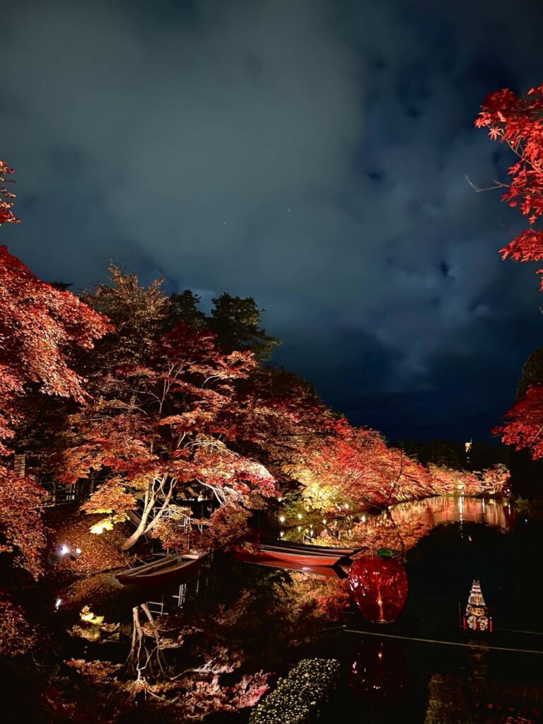 這個時間的光線很溫柔。天空還沒完全暗下來,卻已經失去了白天的銳利,水面倒映著樹影與城牆,隨著風微微晃動。站在那裡的時候,會很明顯感覺到剛剛在卡拉 OK 裡消耗掉的能量,正一點一點被這片景色回收。春天櫻花盛開時,整座公園幾乎被粉色包圍;夏天綠意濃密,氣氛轉為安靜而清爽;秋天楓葉染紅城內步道;到了冬天,雪燈籠與積雪則讓整個城郭呈現出完全不同的表情。同一個地方,卻在不同季節,給人完全不同的感受。